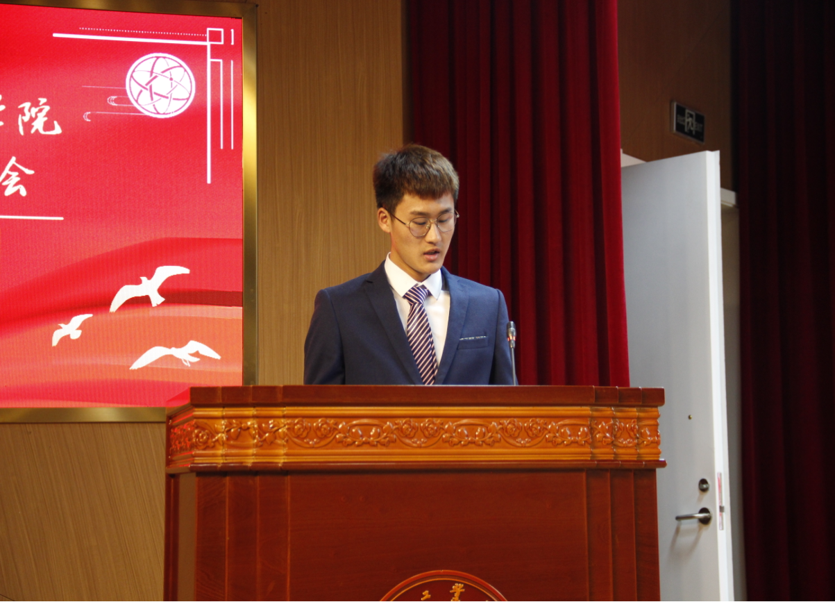 研究生新生代表应用统计专业王旭同学发言。艰苦奋斗是我们党在长期的革命和建设历程中形成的优良传统和作风,也是新中国成立以来一路高歌猛进的重要精神支撑。作为新时代的青年,我们更应明白个人命运与国家民族的命运紧密相连,不畏科研道路上的艰难险阻,打造过硬的本领实力,勇担时代赋予我们的使命,竭尽所学投身于中华民族伟大复兴的光荣事业中!
